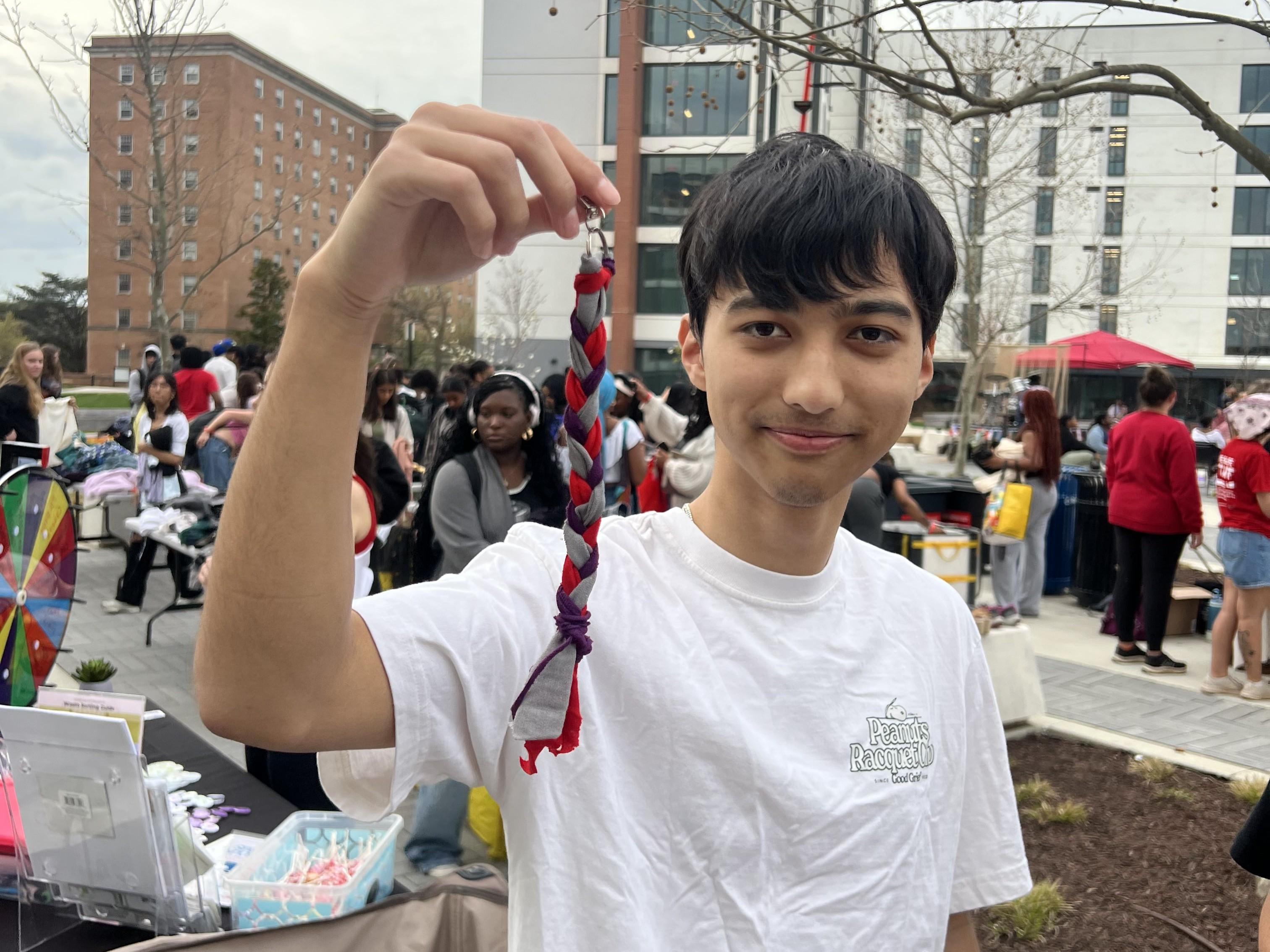 The Office of Sustainability tabled at the event with an activity that promoted reusing clothing by making upcycled key chains out of discarded t-shirts. Participants could braid and tie colored strands of t-shirt fabric together to create a keychain. This activity spotlighted how students could repurpose old fabrics into a creative DIY keepsake.